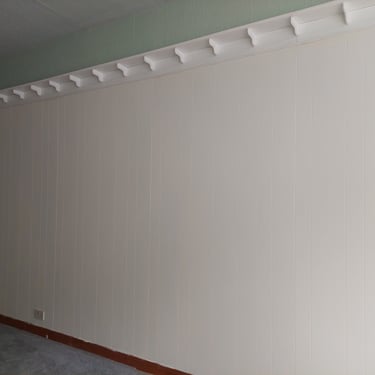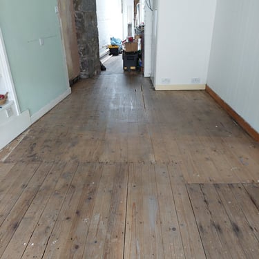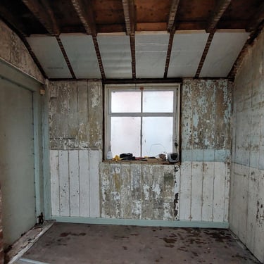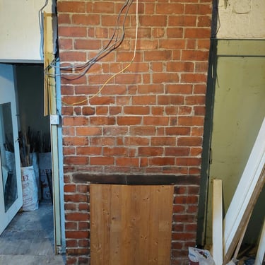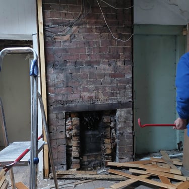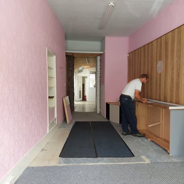We've taken layers off the walls (4-6 of them, wallpaper, battens, plywood, modern wooden panelling, render) and layers off the floor (3, carpet and vinyl). Before we got married I was an archaeologist and I felt like I was revisiting my past as we removed layer upon layer and uncovered some of the history of the shop. We found a chimney breast and fireplace (removing 2 black bags full of old birds nests from the chimney space), a window and door that had been boarded over, original wooden panelling on the walls and some rather nice wooden floorboards. And by removing all those layers off the walls, we must have gained about 4-5 inches more space too.