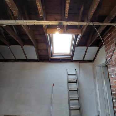 Well, actually it's been rather more than a year. Renovating our shop has taken much longer than we anticipated. I think we were somewhat unrealistic on how long everything would take when we were doing virtually all of it ourselves. And we kept uncovering more things that we had to deal with, repair or replace. A leak in the roof and sky light were investigated and led to the complete removal of all the lath and plaster and replacing it with insulation, a new ceiling and a Velux window. In the past people have dealt with issues of cracks, rotten bits, leaks etc by covering them up with for example, some plywood and then if you can't see it, then the problem no longer exists and you can forget about it. And so it goes on until somebody in the future (ie, us) decides to deal with it properly.